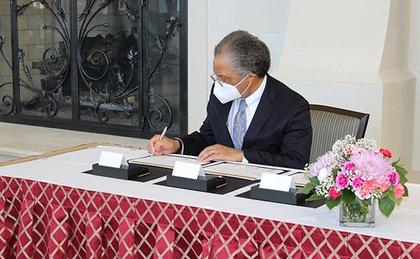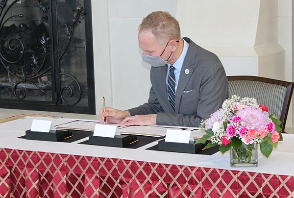 ACC总统Algie Gatewood,伊隆大学康吉书籍和阿拉米斯伯灵顿学校系统Substendent Bruce Benson在埃隆校区聚集在一起,签署了意图朝着创建计划的宣言。